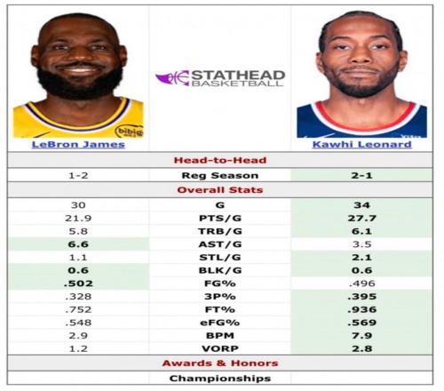 本赛季小卡场均27.7分6.1板3.5助2.1抢断,詹姆斯场均21.9分5.8板6.6助1.1抢断,两队本季交手3次,快船2胜1负同样占优。